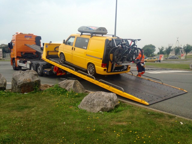 After a successful night of packing up the van, not sleeping through our alarms and making the train on time I filled the van up with petrol in Calais, not good when it’s a diesel. Drove 5 minutes up the road before I realised, made it to a service station and called the recovery people. Hopefully the tank can be drained, replaced with diesel and we’ll be on our way, normally you would replace the fuel filter but I reckon with the amount of diesel going in it will be fine, might run a bit rough while the petrol clears but no proper damage.
