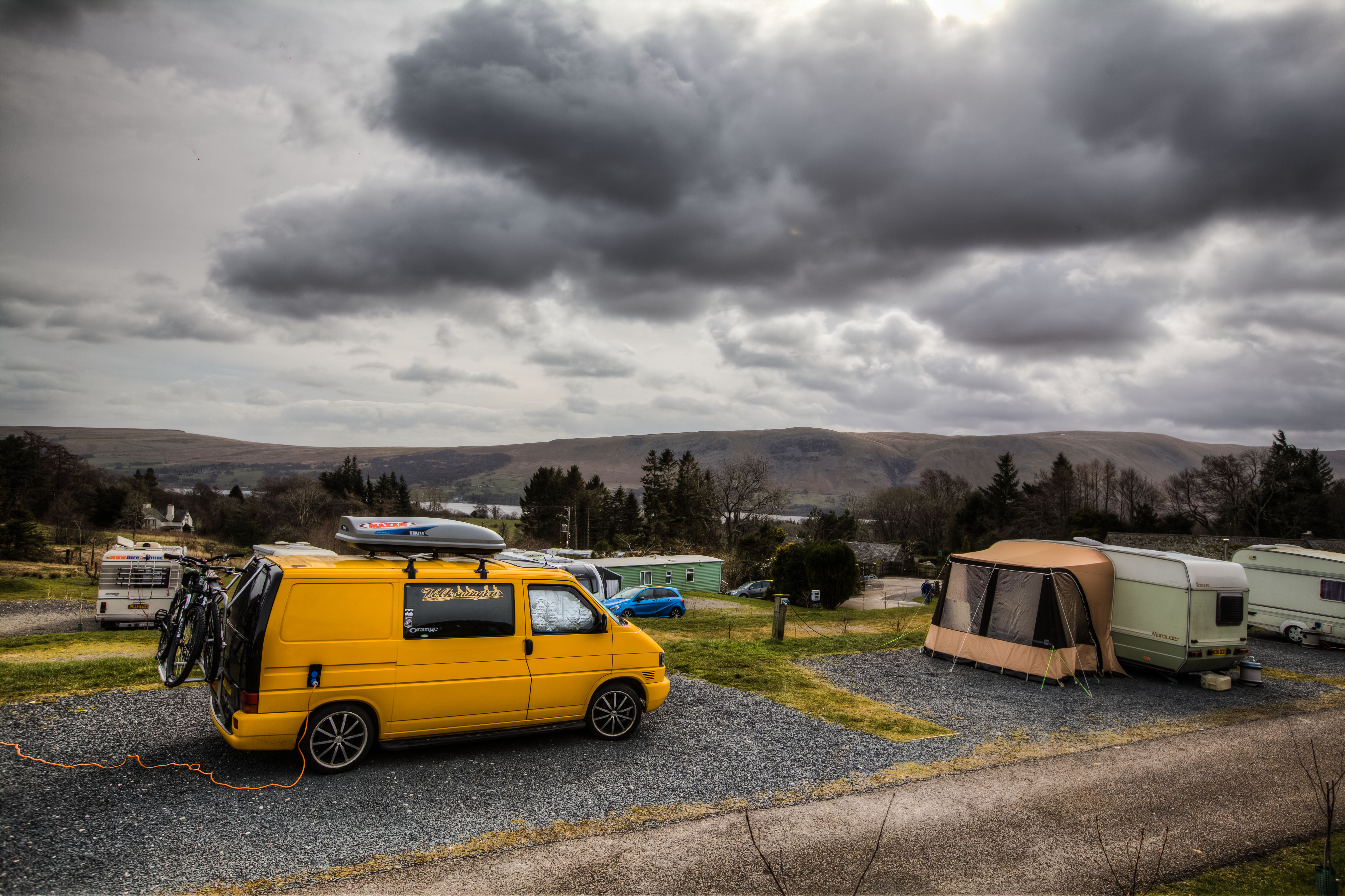 The reality was somewhat less romantic, the van was battered for the night by what we thought were gale force winds blowing down the fells, over the lake and up on to our side of the valley, as we were parked side on our van really took a bashing and at that point I had refused to take the cycle cover off as I didn’t want the bikes getting soaked so that blew around for the evening like a loose sail keeping us both awake. They most likely weren’t gale force but they were mad enough for the staff to comment “so, you survived the night then?”