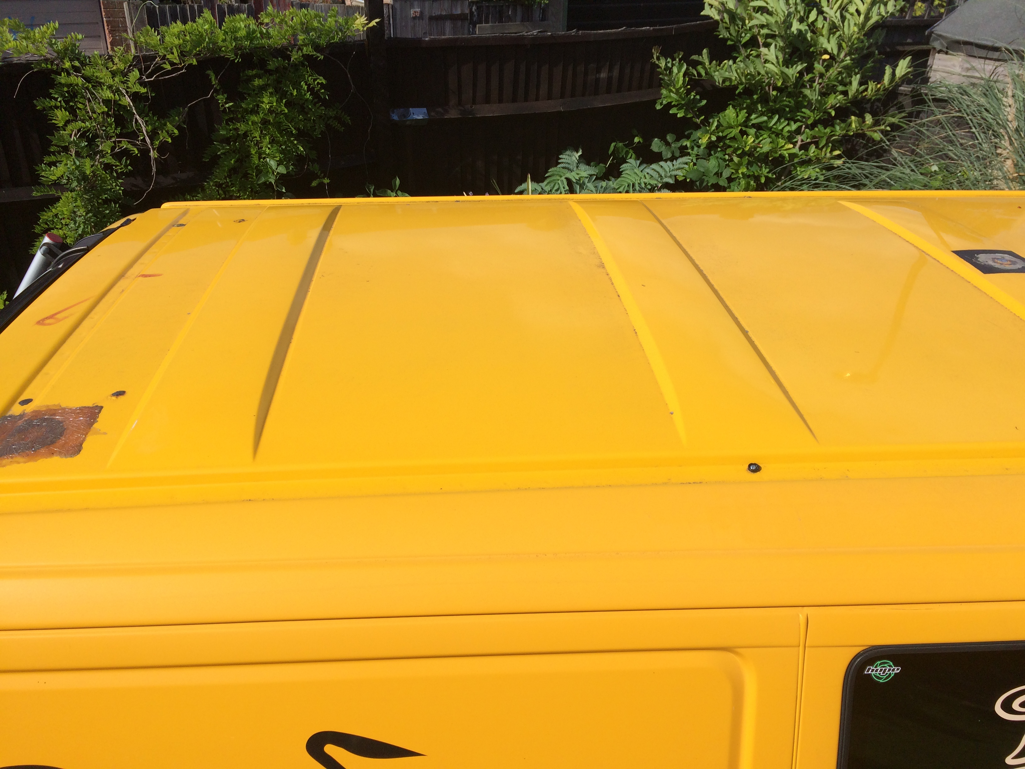 With the panels in place and lots of excessive cable kicking about I left them for about ten minutes and then pulled off the masking tape, this gives a nice clean edge of adhesive around the panels, I left for a further 15 minutes and then cut off the excess cable from one positive and one negative leg and soldered them together thus wiring the panels in series, now I have 100 watts for solar power! Lastly I placed a towel over the panels and used small concrete tiles to distribute even pressure to help the panels bond to the roof, I left them overnight and resumed work the next day. As you can see from the picture above, the panel to the left doesn’t bond completely to the roof, most of it is bonded to the roof with a small part bonded to the rib, thats another reason for using the semi flexible panels, you can bend them a little. When driving the airflow over the roof will be travelling from right to left of the above picture so there is no risk of air getting under the panel and ripping it off.
