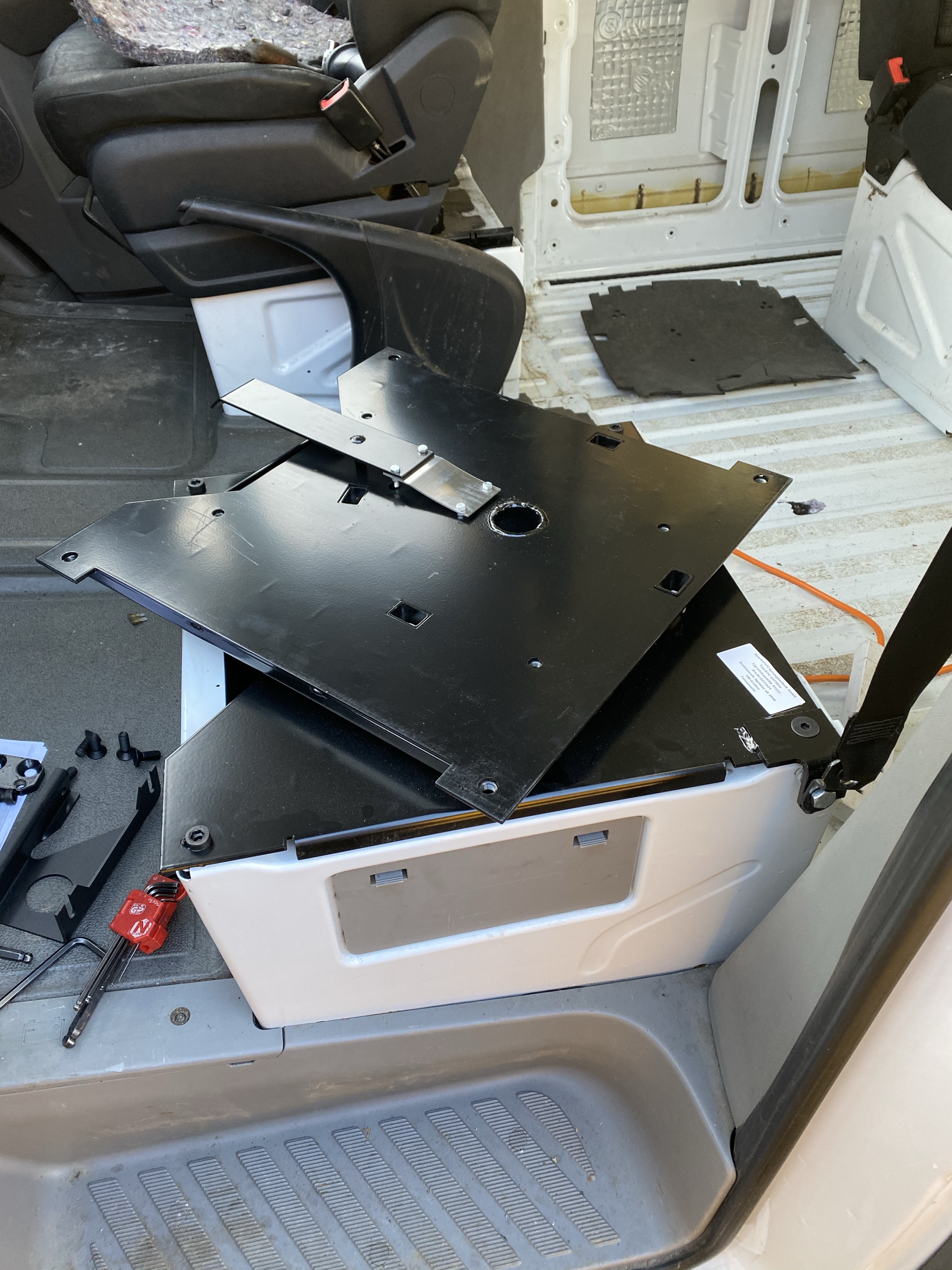 Sourcing a single passenger seat and seat base for a sprinter is an expensive business, they are stupidly priced, often just a used base on it’s own is £100.00 and a used seat upwards of £150.00. Handily I found a seat and base for £30.00 on gumtree, I had to pay £70.00 for it to be delivered and it has some slight damage but honestly, that’s a proper bargain.