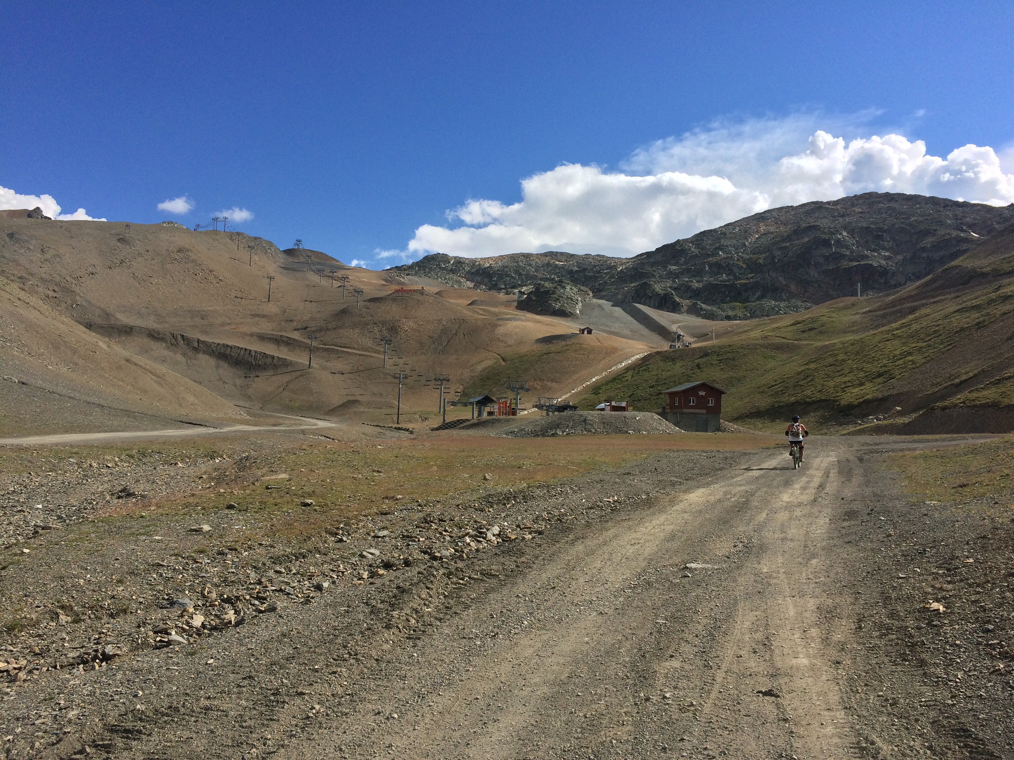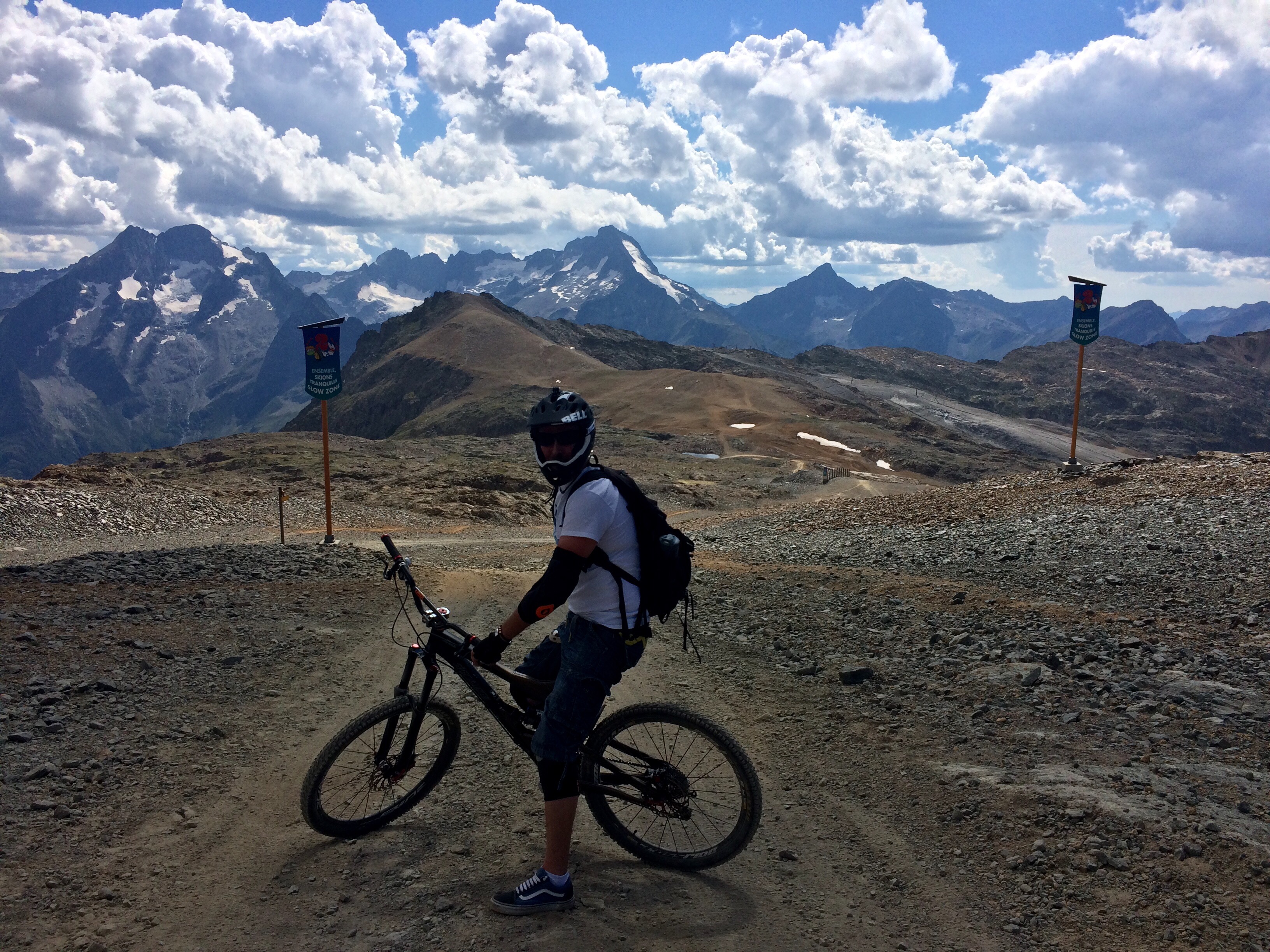Our day started much like any other on this trip, tea with the added bonus of a nice lie in.  There was much faffing about and we didn’t get ourselves ready to do anything on the bikes till about two, we met a bloke in the car park called Sven who was from Norway but his accent was a mix of Scottish, Irish and Norwegian, he gave me his bike pass for five euros as he paid for the day but was too shattered to ride anymore, result, a ticket to the bike park costs 25 Euros and when I say bike park I mean a lift up 3200 meters to the glacier and a while mountain to play on.
