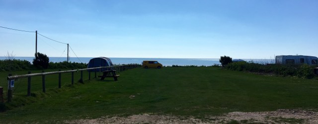 A short drive later we’ve arrived at Grange Farm in Brighstone, a lovely little campsite overlooking the sea which at this time of year is nice and quiet, just how we like it. Our pitch is level and we have electricity but best of all our door opens out to a view of the sea, I grabbed a quick shot of Lolly and Bumblebee with the sea in the background.